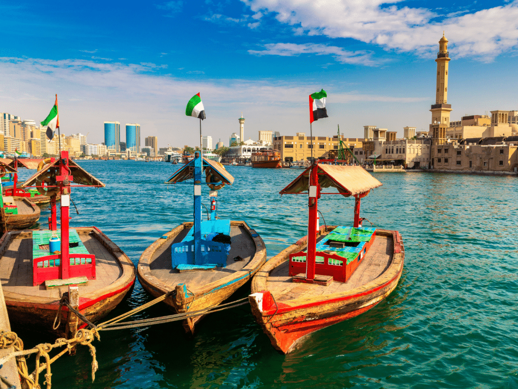 Und die Altes Stadt, Sie fahren mit einem Wassertaxi (Abra) und ein Spaziergang durch die traditionellen Märkte von Dubai, wie den Gewürzmarkt und den Goldmarkt (Gold Souk), w o Besucher Gewürze, Düfte, Schmuck und mehr kaufen können.