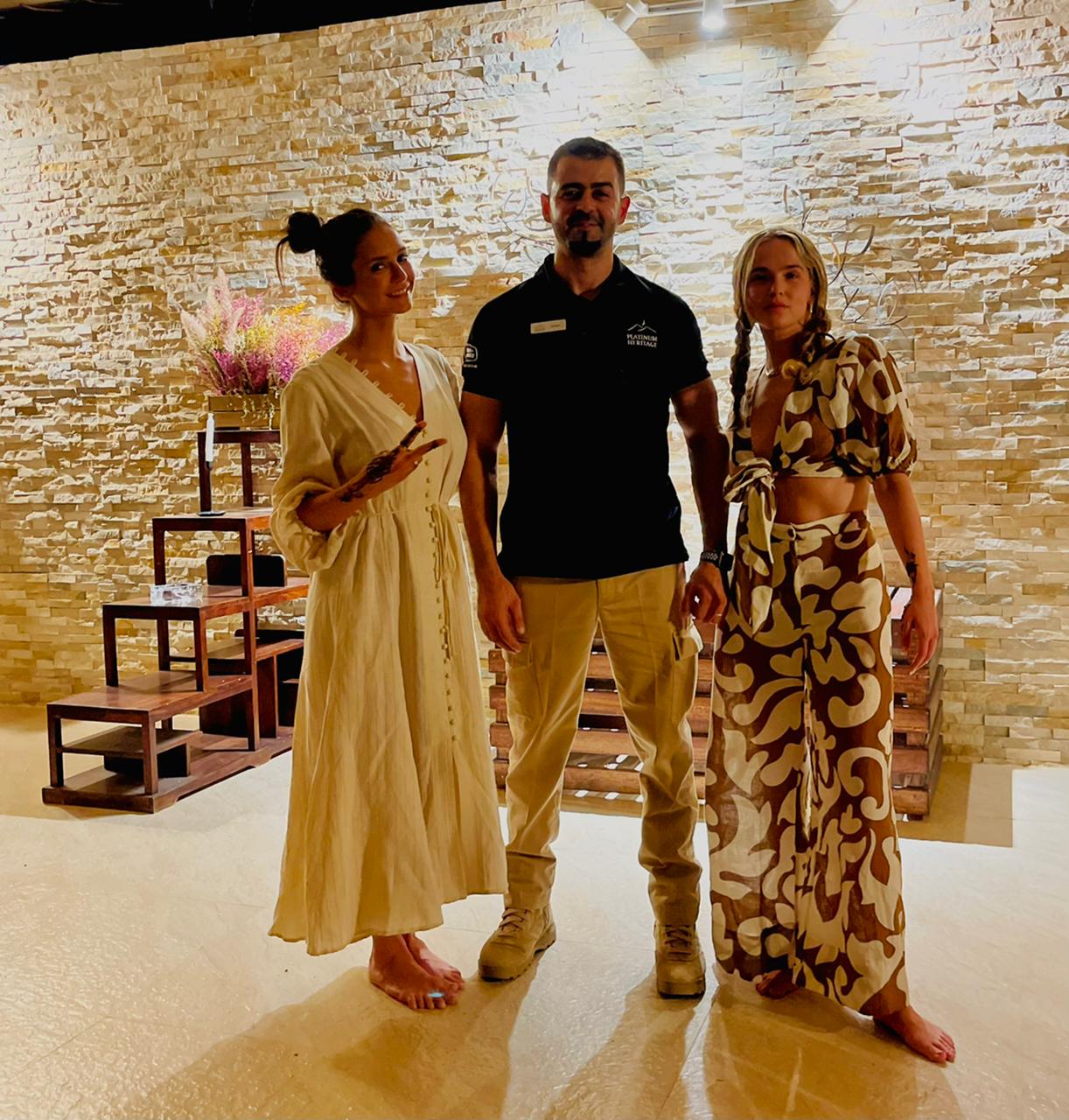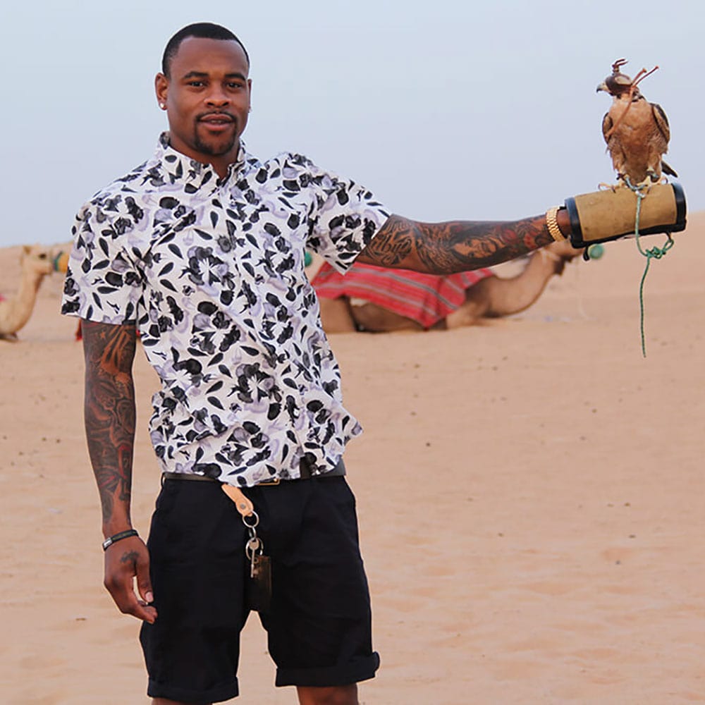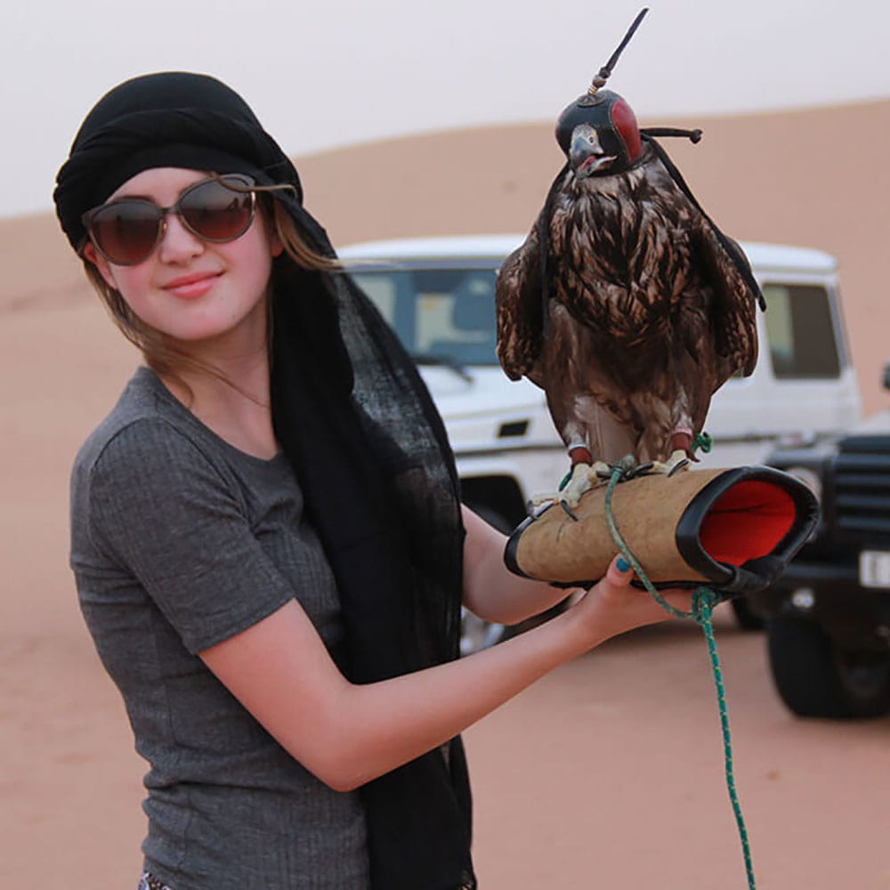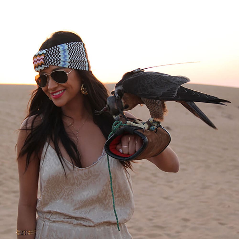 Wenn die Sonne über den Dünen untergeht, erleben Sie eine spektakuläre Falknereivorführung durch einen erfahrenen Falkner, während Sie Canapés bei Sonnenuntergang genießen und prickelnden Saft schlürfen. Entspannen Sie sich beim Abendessen in einer ruhigen Wüstenoase und begeben Sie sich auf eine kulinarische Reise mit feinem Essen und sechs Gängen. Ihre private Cabana ist von sanften Dünen und der ruhigen, friedlichen Wüste umgeben. Der Abend endet mit faszinierender Feuer- und Akrobatikunterhaltung, die Sie fesseln wird.